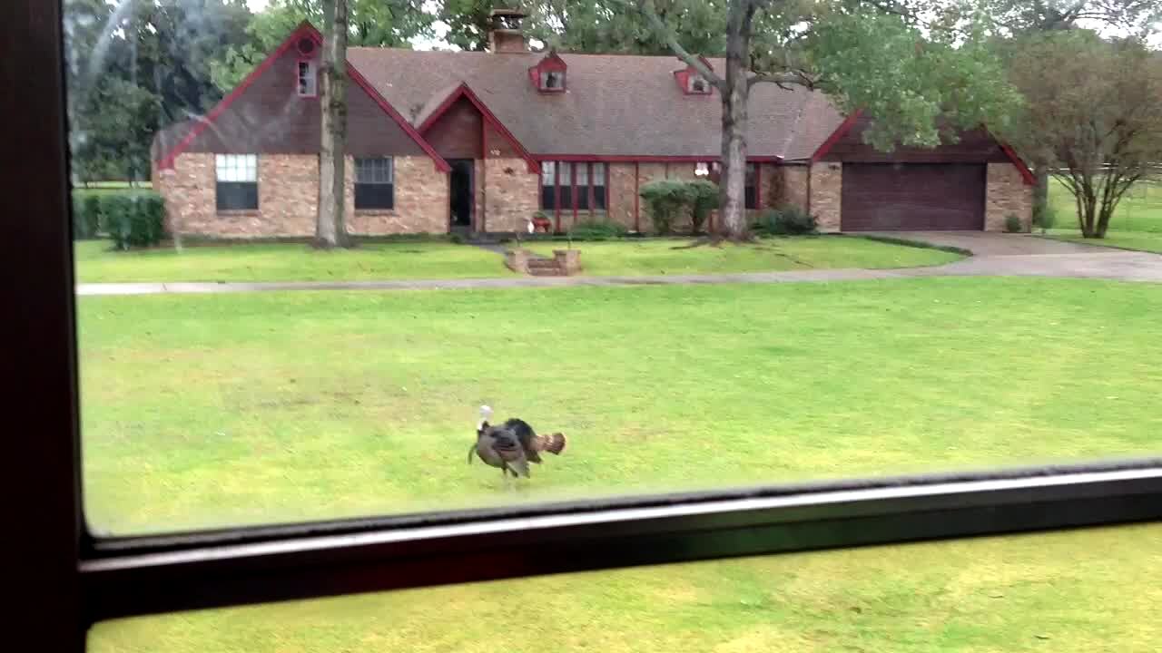 A wild turkey chases a dog around a front yard, then a woman screams as she tries to guide the dog to the front door. Security footage.