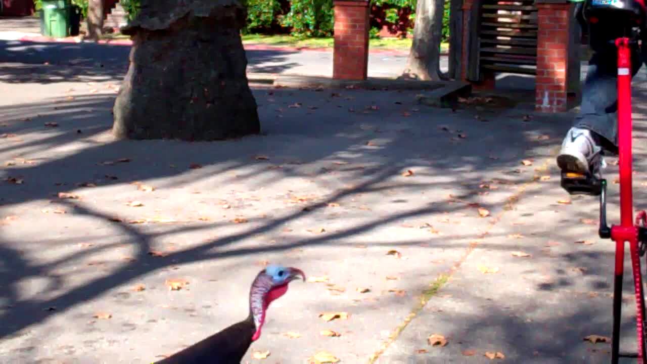 A turkey chases a boy on a unicycle outdoors, amusing the woman behind the camera.