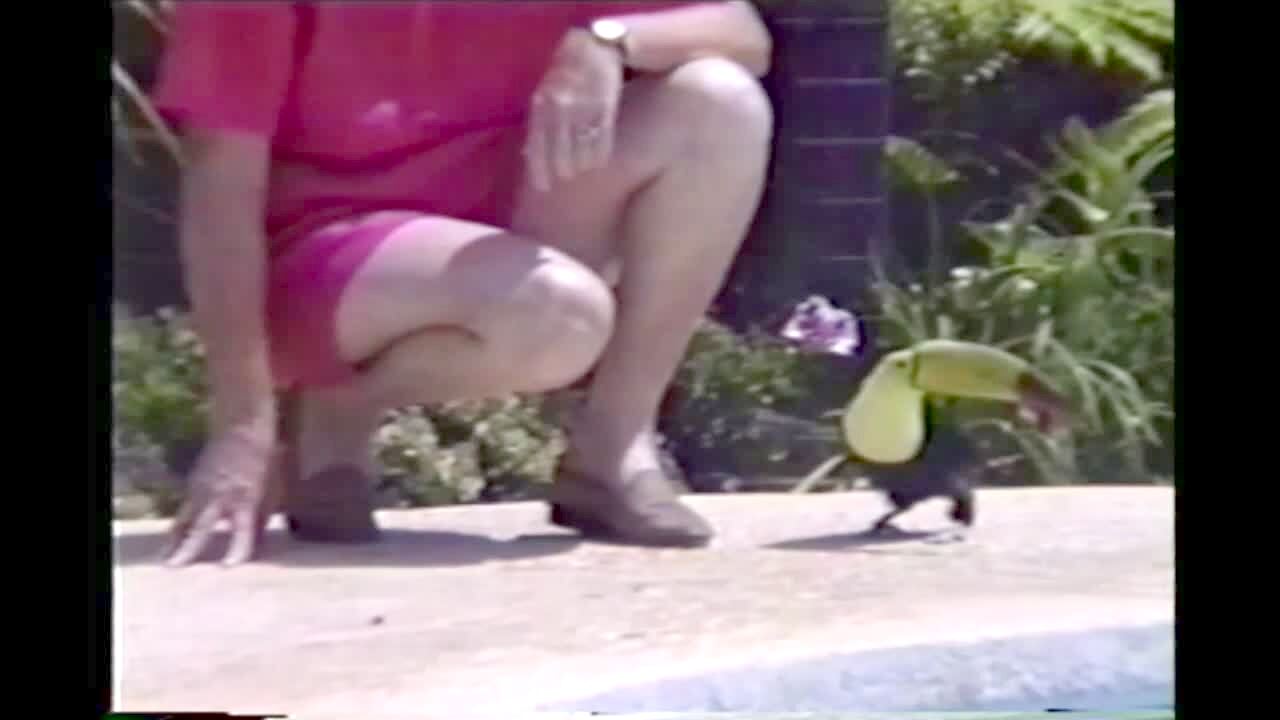 Toucan bird hops over to cameraman & starts attacking his feet, biting him with its beak. Backyard, pool, summer. Silly pet tricks.