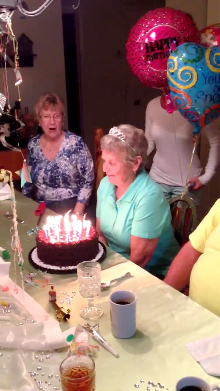 A family sings the Happy Birthday song to a senior woman in front of a cake at home. After the woman blows out the candles the entire family sprays silly string at her.