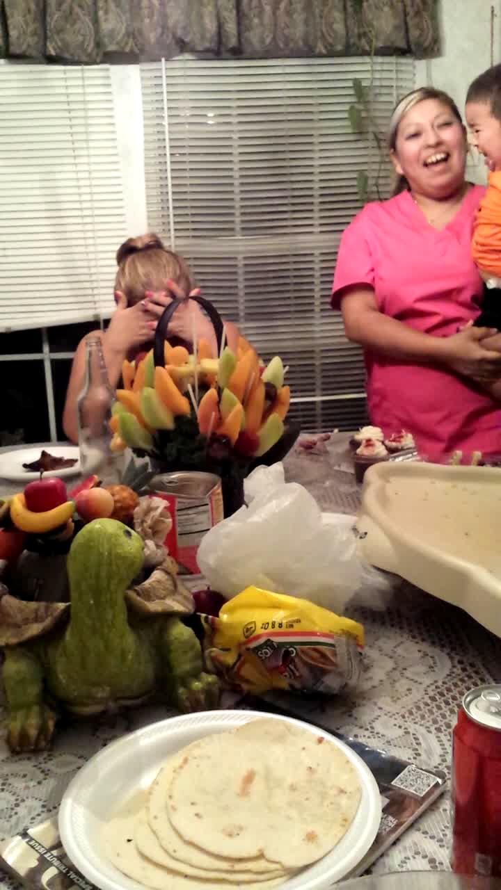 Woman carries a birthday cake toward young girl and drops it. Cake falls onto the table. Family sings Happy Birthday.