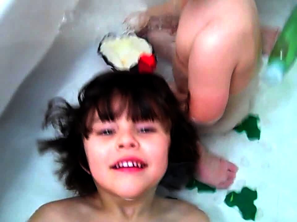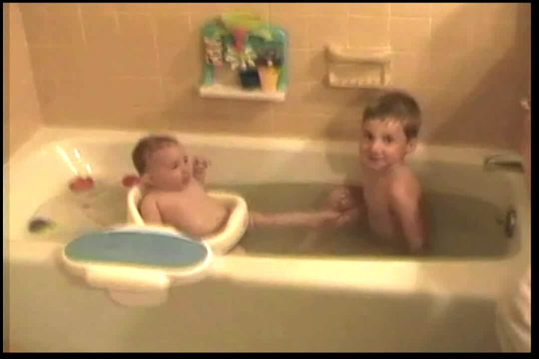 Boy in bathtub makes a fountain with his mouth. Baby in bath tub giggles. Siblings.