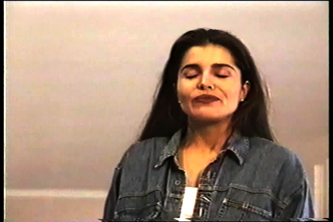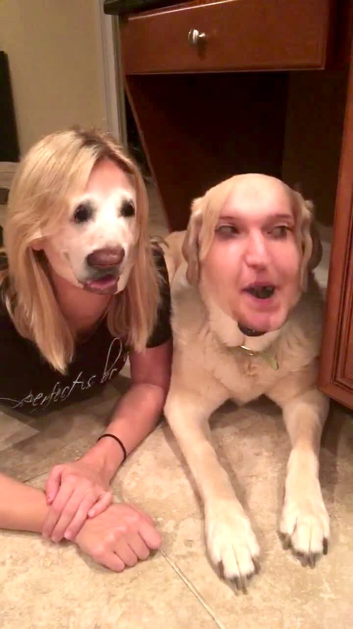 A young woman and a dog do a face swap in the living room and the woman tells the dog it has bad breath. AA: face swaps