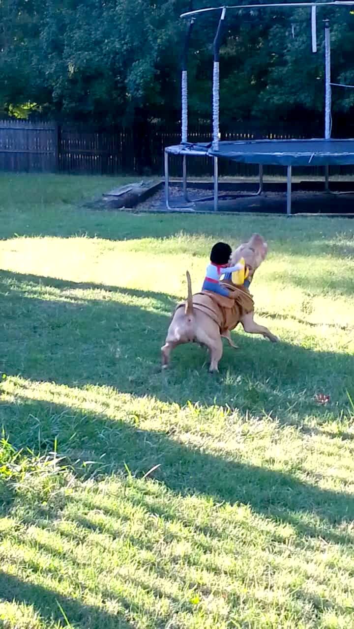 A pit bull dog is wearing a saddle with a cowboy doll on top and acts like a real bull trying to dislodge it outdoors.