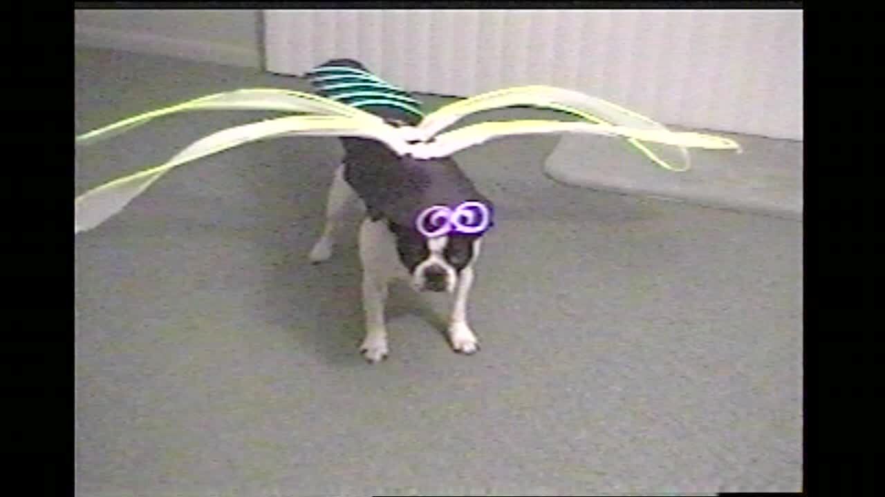 Dog has a dragonfly costume on that glows in the dark with glow sticks. Woman turns the light on & Boston Terrier looks sad. Halloween. Pet.
