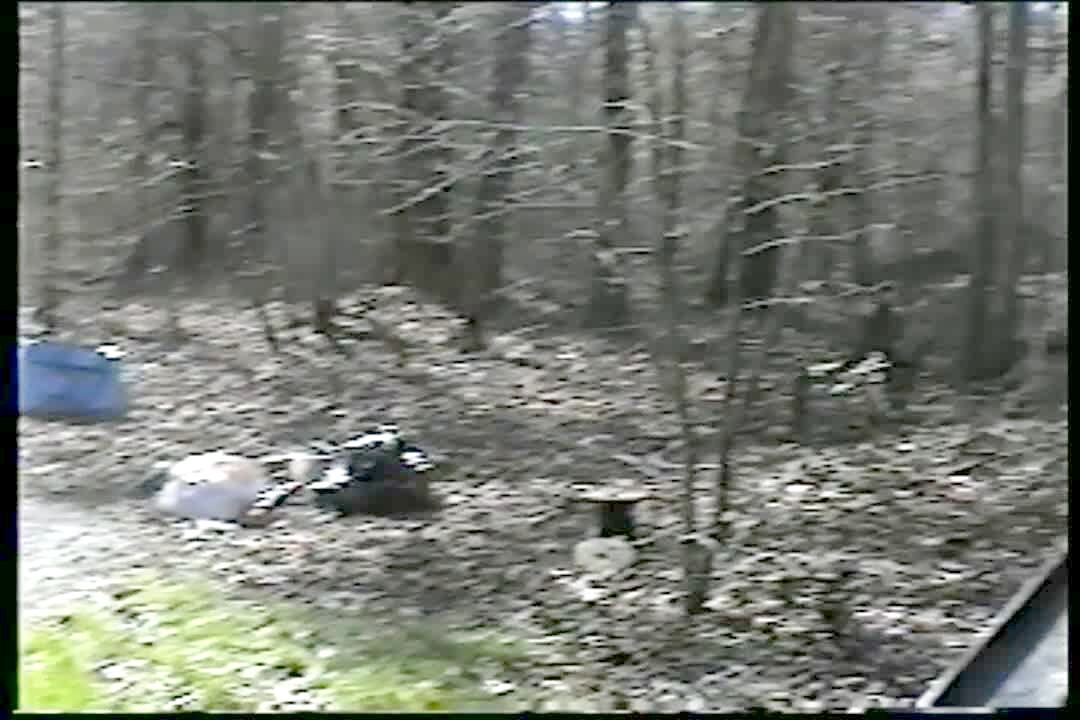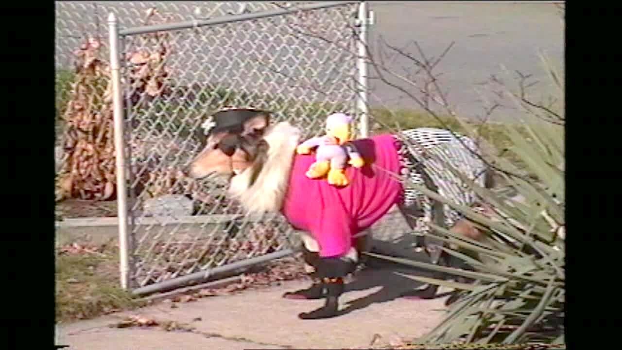 Man is dressed in costume as an old lady looking for a lost dog, she has a dog stuck between fake butt cheeks. Halloween.
