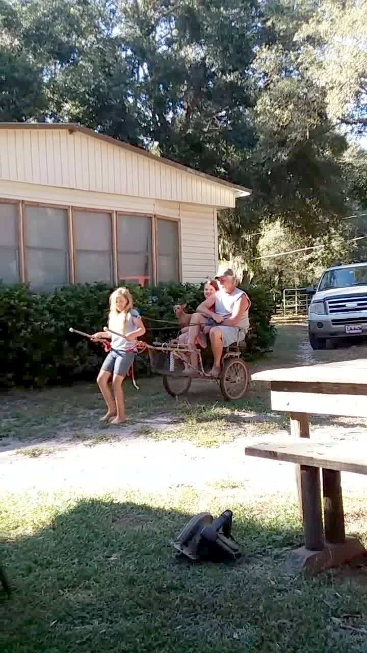 A young girl pulls a man and a woman in a cart in a yard. The cart tips too far back and the man and woman fall backwards and the girl goes into the air.