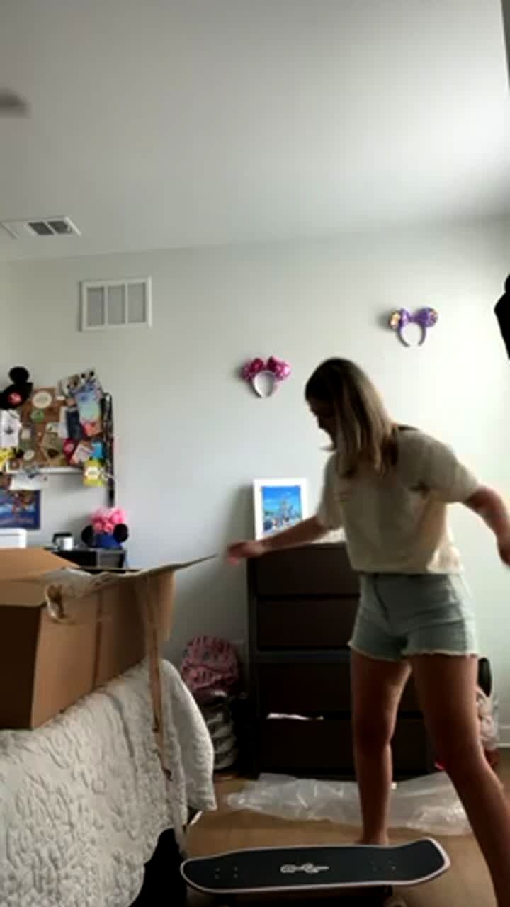 A woman tries to jump on top of a box but it tips over and she falls in the living-room.