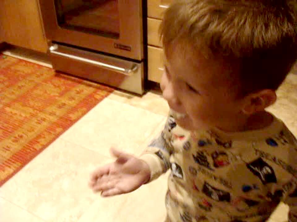 A tot boy pets a cat on a couch. He tells the cat that there is nothing to be afraid of. Then the tot looks at the cat's rear and says, "That's a butt hole. You don't want to touch that."