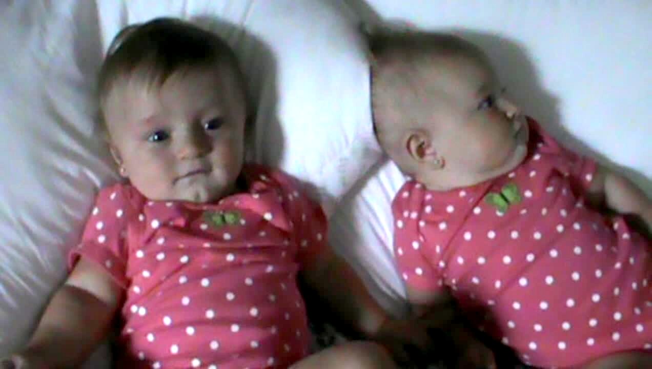"Raspberry Babies" Two twin baby girls lie on a bed next to each other. One of the baby girls blows raspberries and the other laughs. Very cute.