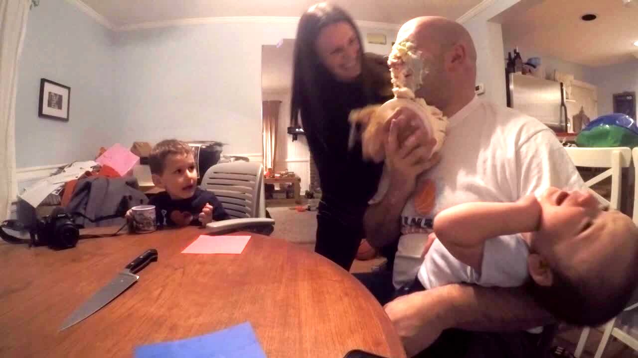 A man and woman get ready to cut a cake for a gender reveal and the woman smashes the cake in her husband's face and they find out they are having a girl in a house.