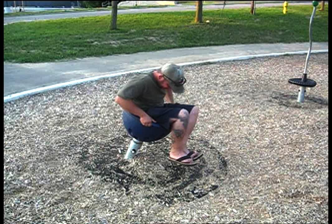 Man spins himself dizzy in a twirling saucer at a playground. He gets off and tries to run, loses his balance and falls down.