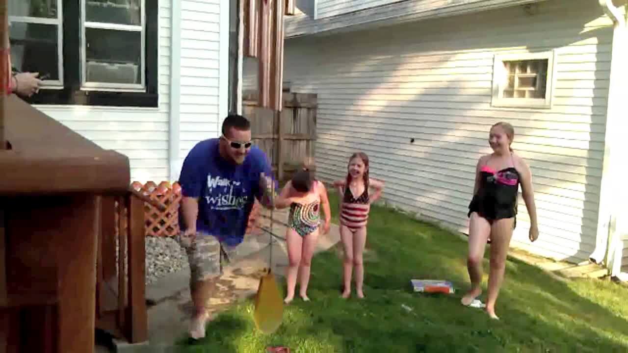 Man falls head first down backyard water slide. Man at the bottom falls awkwardly into the grass. That man also gets hit in the face by rope that springs back from a kid sliding. Man falls down steps and almost knocks over children.