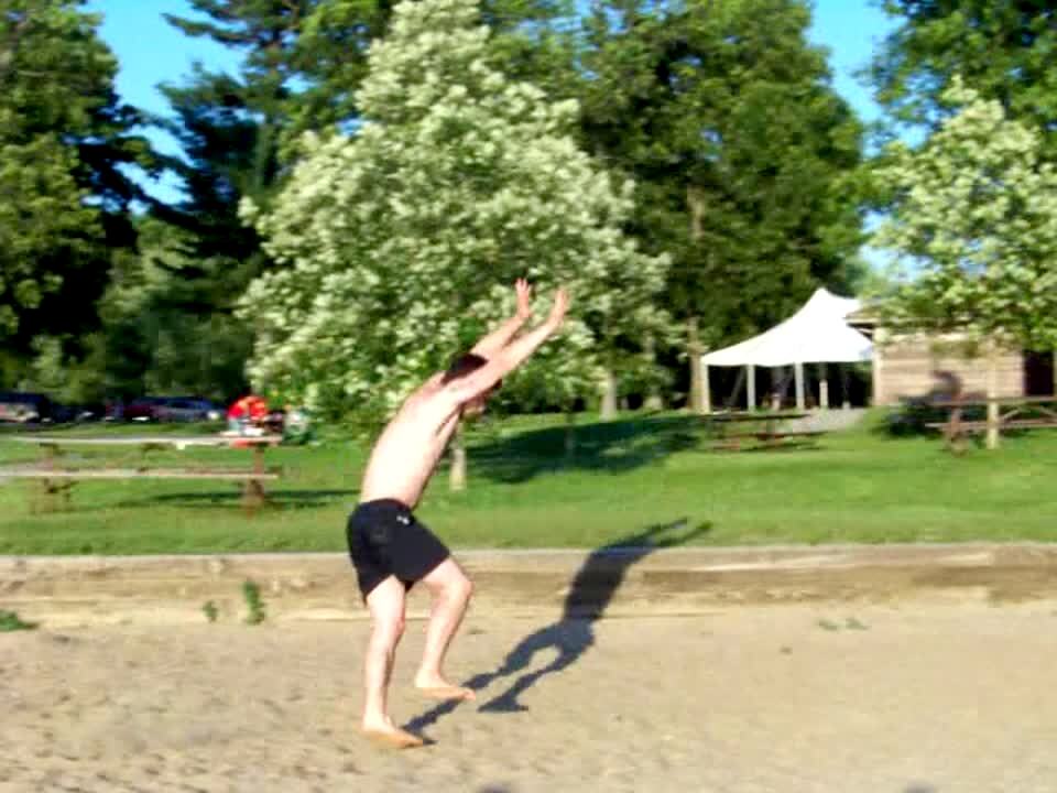 A man says Ow when he does a flip over a kiddie swimming pool and lands on his back after he slides down a slip and slide on a hill in the backyard.