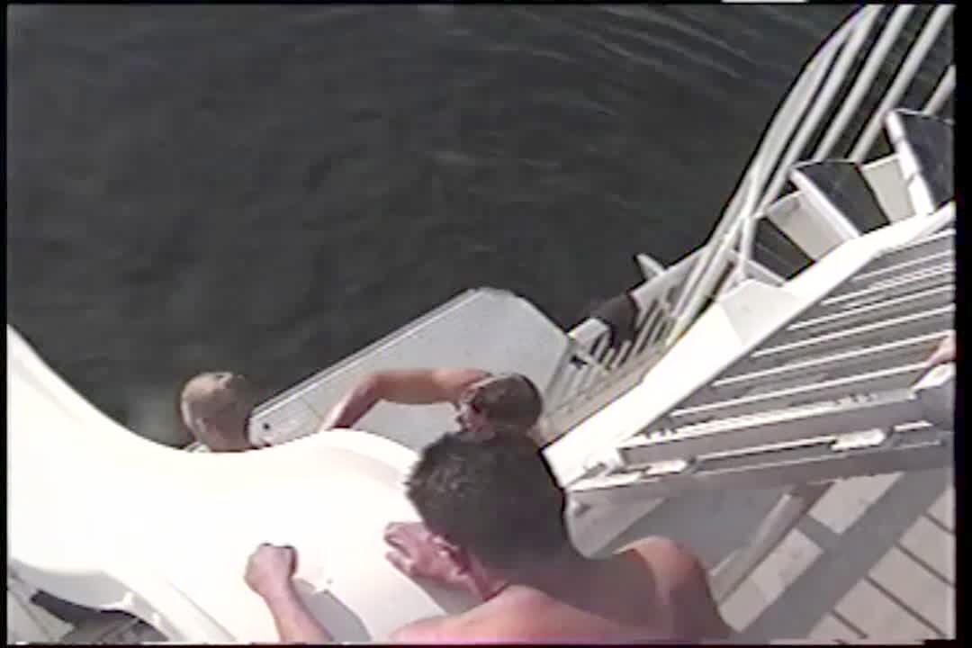 A spiral slide falls over beside a swimming pool when a man goes down the slide.