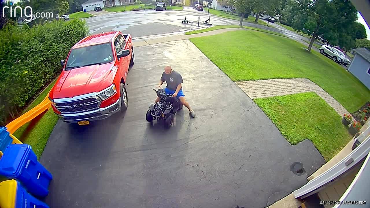 A man rides a four-wheeler ATV and crashes into a garage offscreen. Security footage.