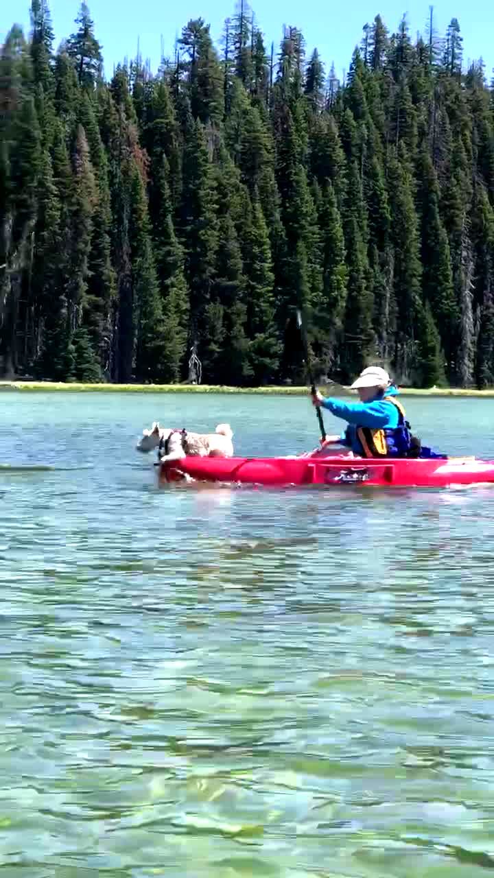 A woman paddles in a kayak in a lake and a terrier dog sits on the front of the kayak and paddles in the water.