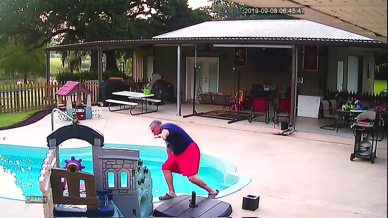 A man steps on a bug on the side of his swimming pool but he slips and falls into the water. Security camera footage, no audio.