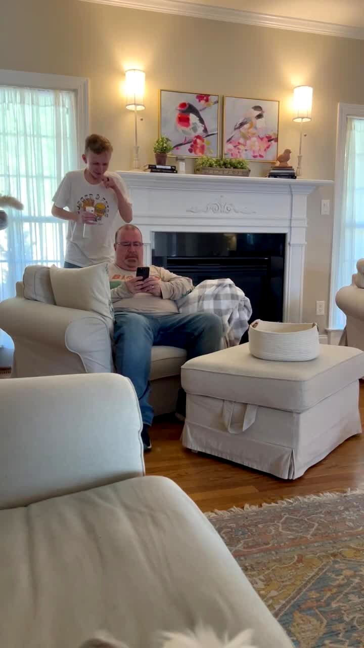 A teen boy pretends to sneeze behind a man, then he sprays him with a squirt bottle in a living room, and the man yells.