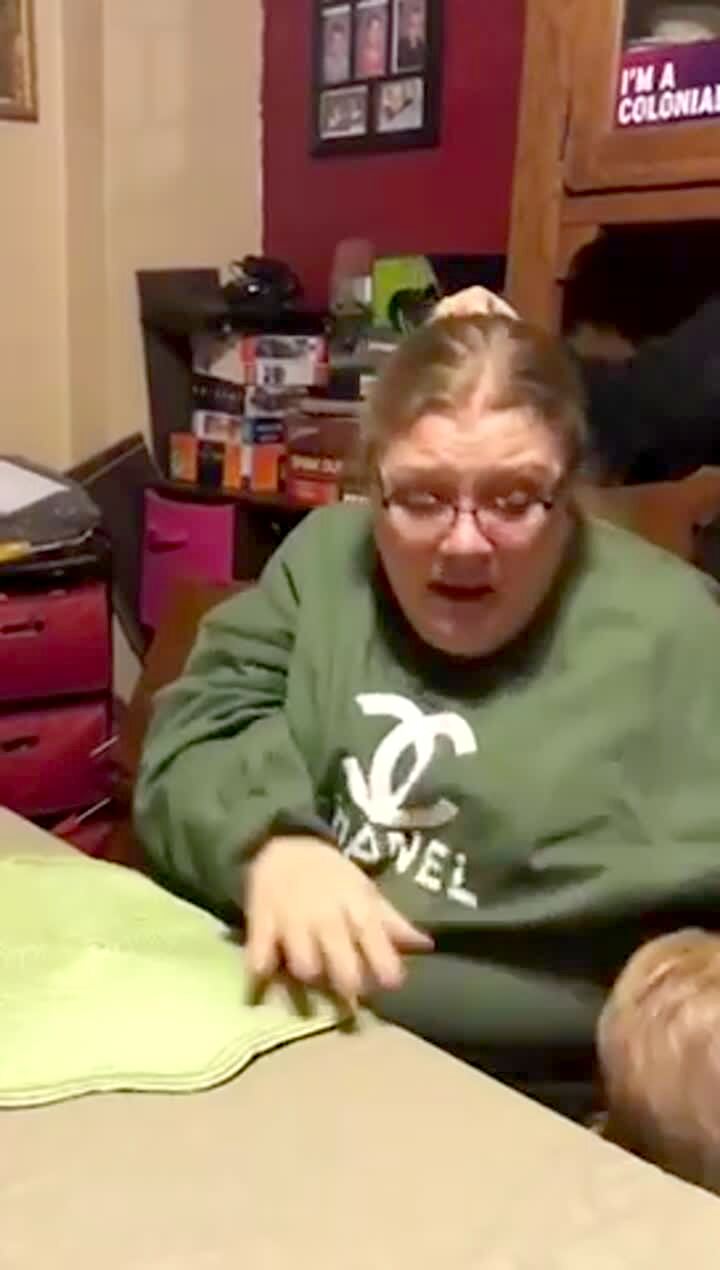 A mom opens a cabinet in her kitchen and a fake mouse falls out. She screams and says she peed her pants as her sons cheer.
