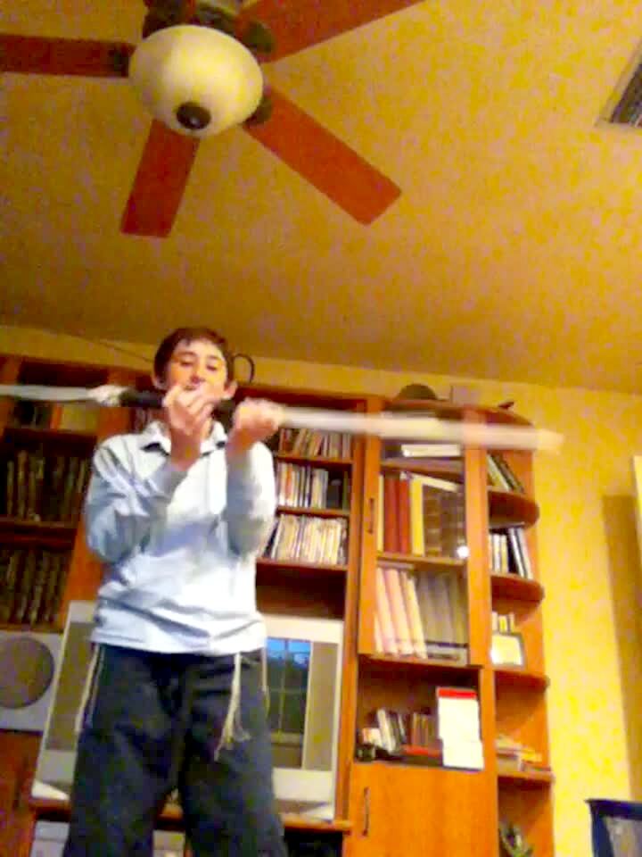 A young boy spins two Nerf toy swords around and breaks the cover of a ceiling fan.