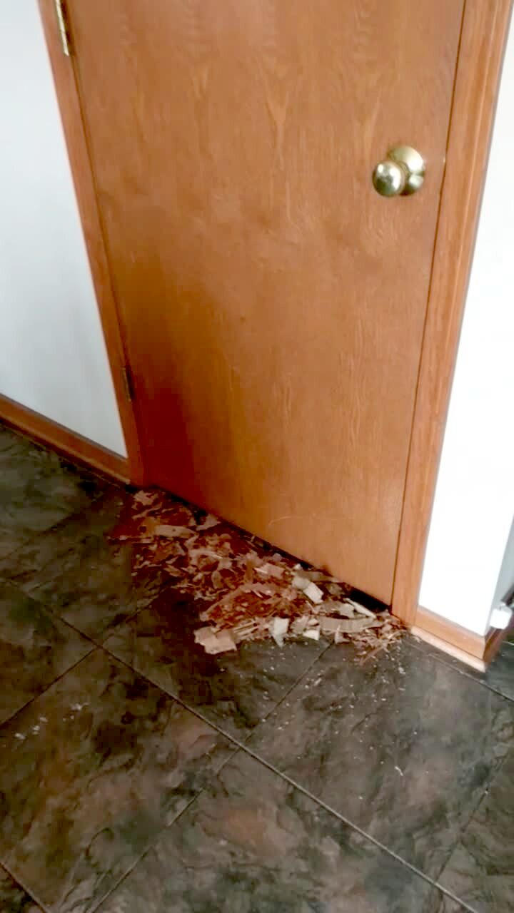 A woman films shards of wood at the bottom of the door. She then opens the door and the back is completely shredded with wood chips everywhere and a dog standing at the door.