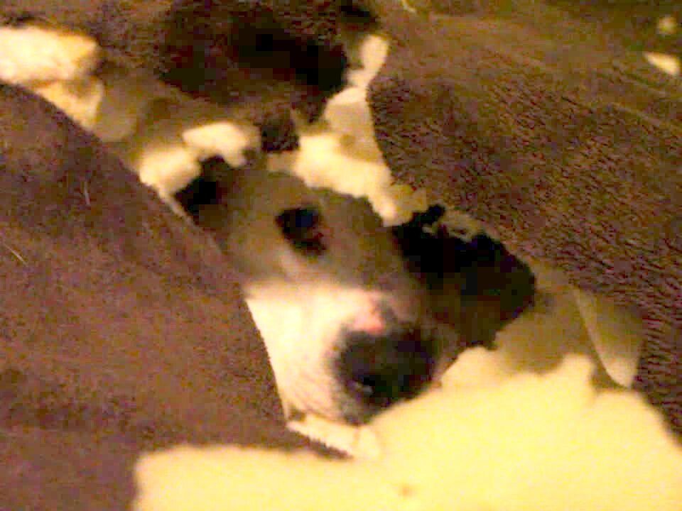 A woman finds a hole torn into her mattress. She gets closer and a white dog pops her head out of the hole before another dog joins her on the bed.