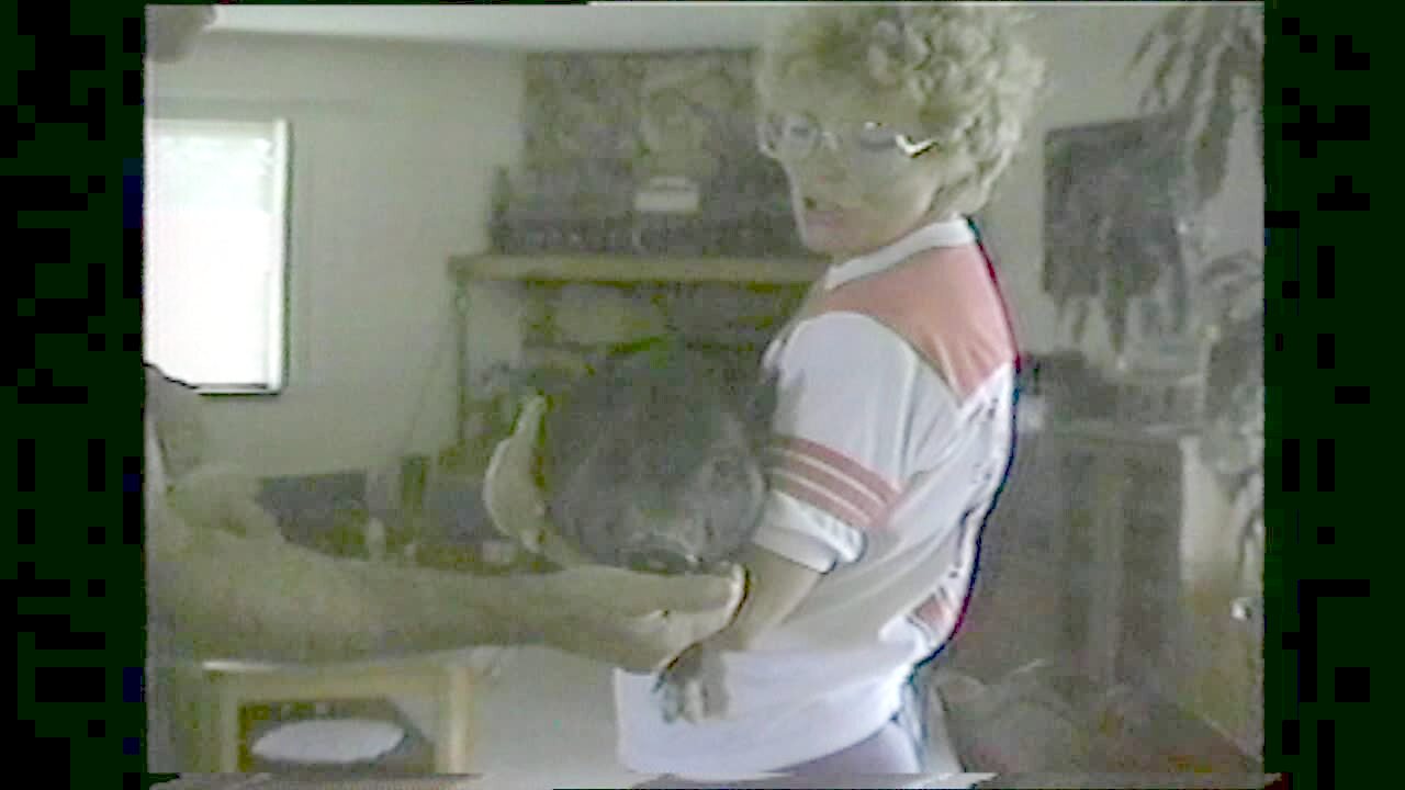 A woman talks to a pig on a couch in the living room as the pig chews on feathers. An eviscerated pillow is seen on the couch.