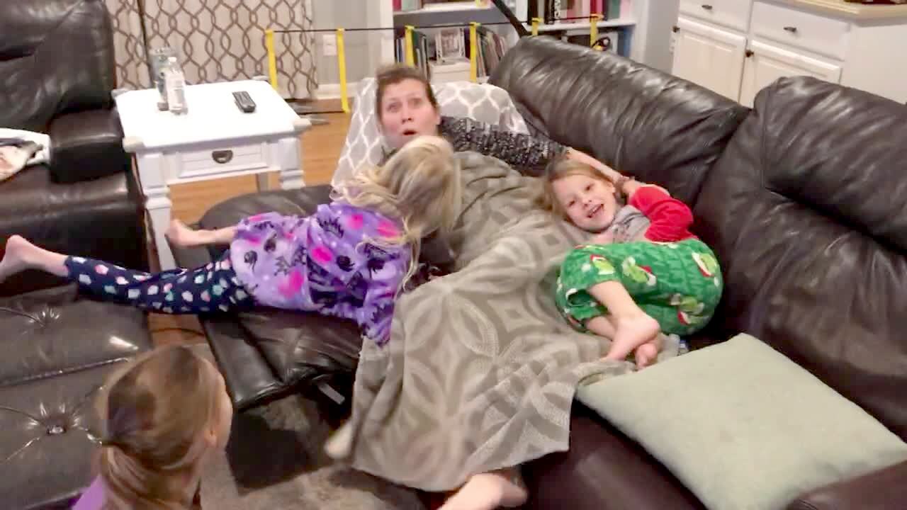 A woman sleeps on a couch in the living room and her family yells "Happy New Year" and scares her awake.