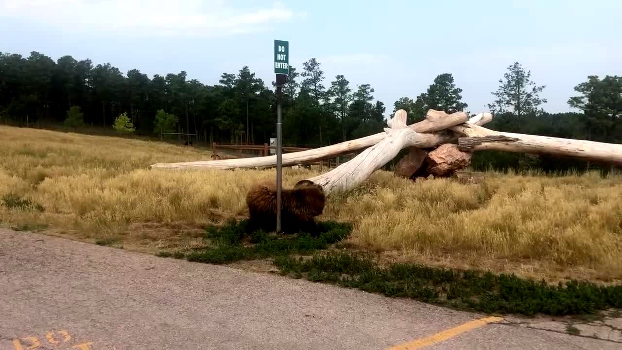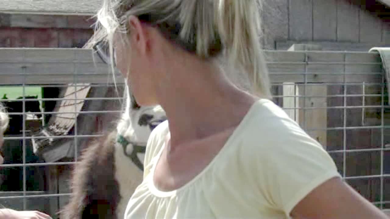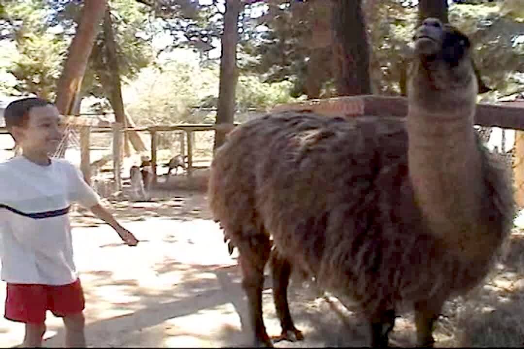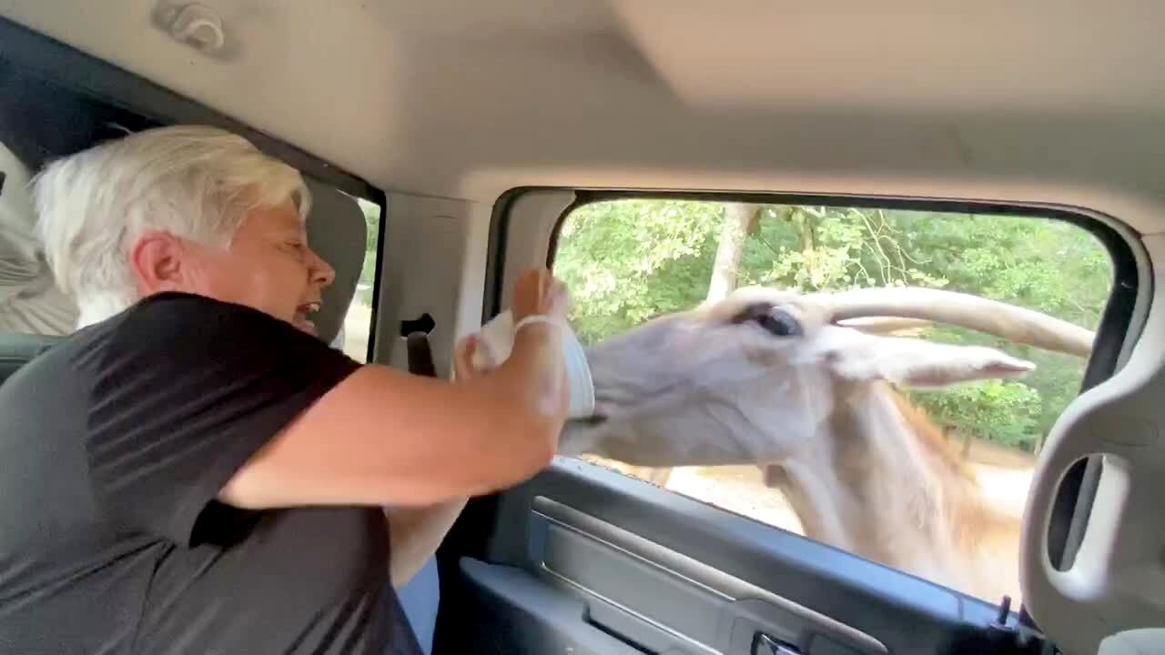 A senior woman feeds gazelle at a drive-through safari park, and when the gazelle pulls the container away from her she says "why didn't we go to somebody little?"