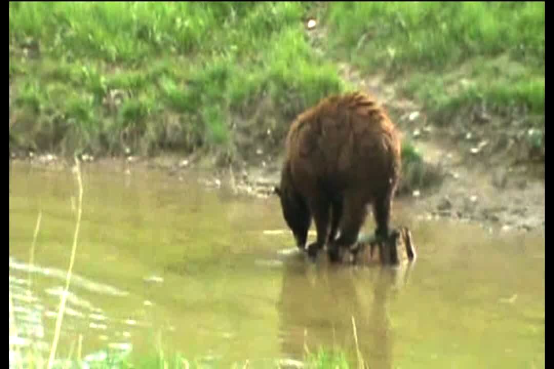Man films bears in the pond from his car, another brown bear suddenly appears and scares man, biting at his side mirror.