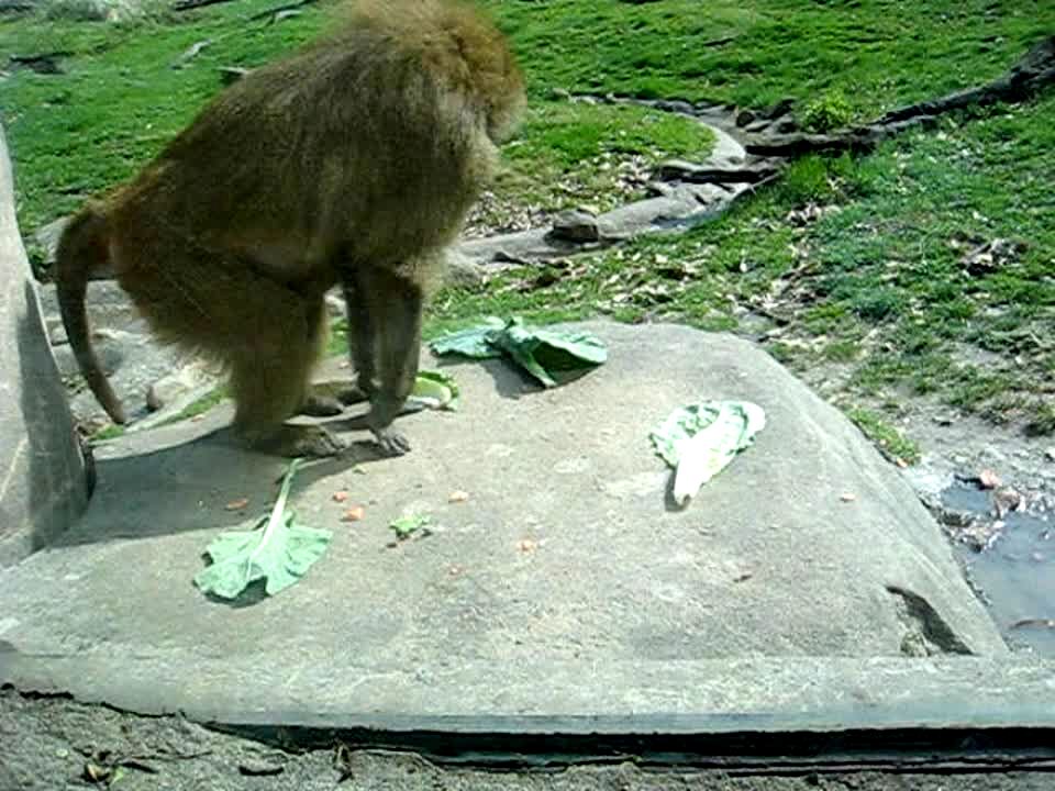 A turtle at the zoo is stuck on his back. Each time he manages to flip back onto his feet, a monkey flips him back onto his back.