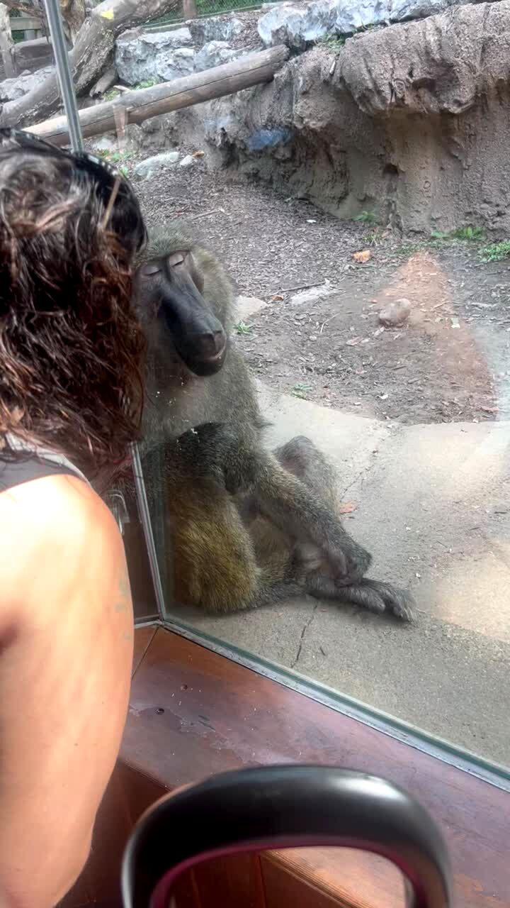 Baboon monkey sticks butt on glass in man and tot girl's faces at zoo display.