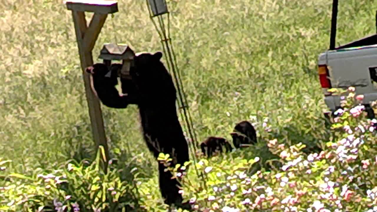 A bear and her baby eat bird seed out of a feeder hanging outdoors and the baby cub hangs on it before falling.