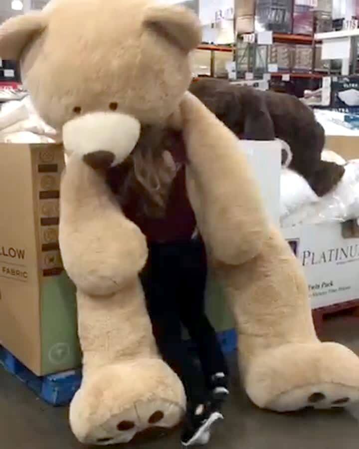 A young woman carries a large oversized stuffed bear in a store and struggles to put it in a box. It tips over and falls on her and she gets stuck underneath it.