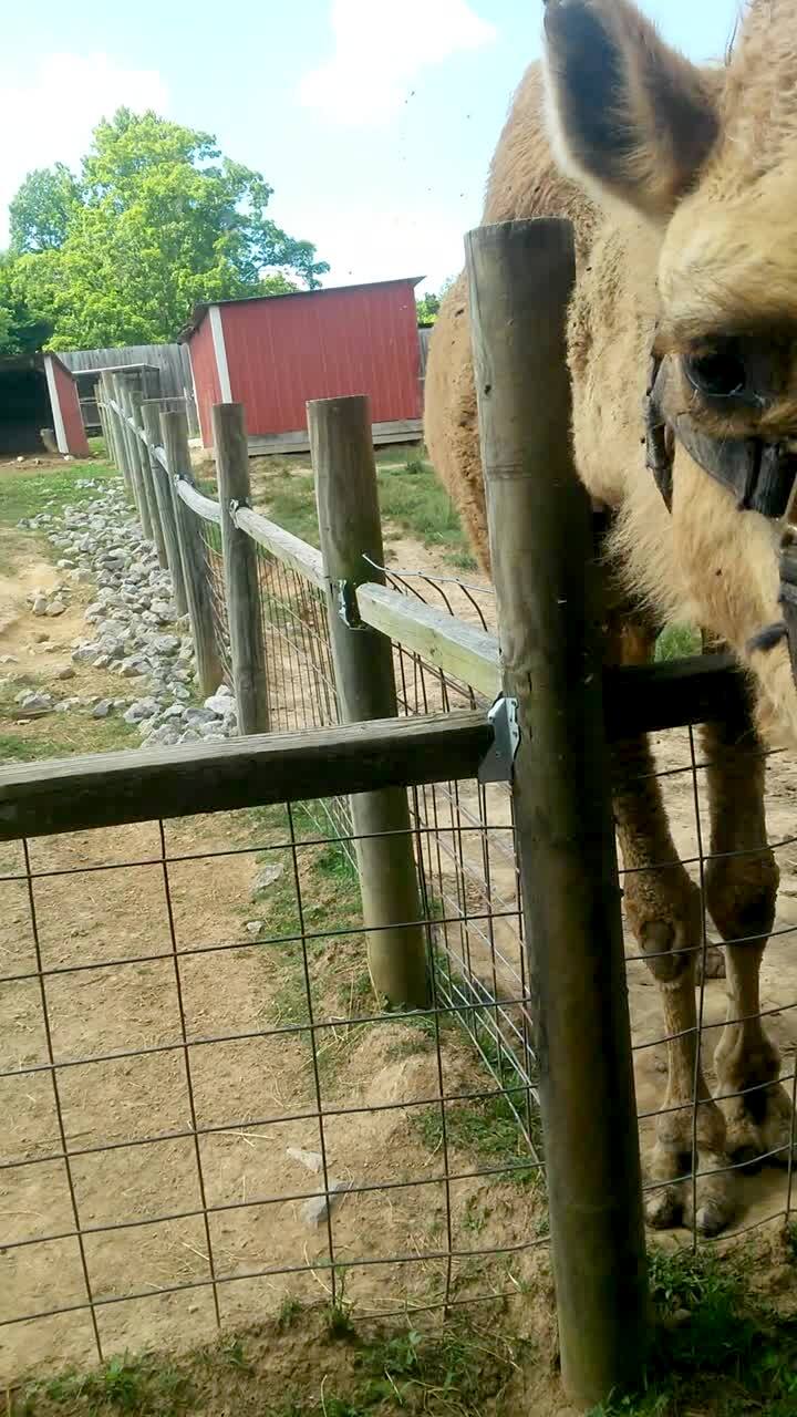 A camel snatches a bucket of feed from the man behind camera outdoors at a petting zoo.