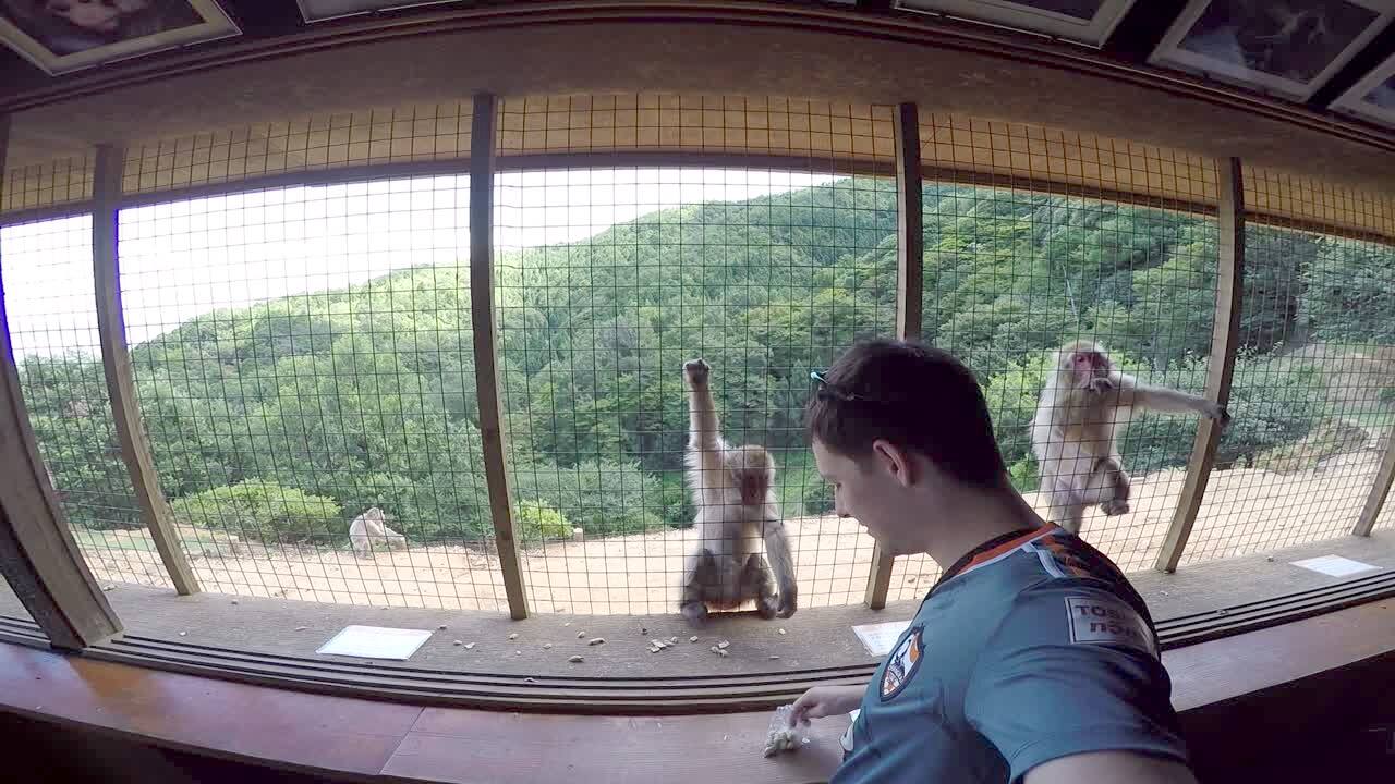 A man gives peanuts to monkeys at a zoo and when he gets to the third monkey, the second monkey pushes it away and takes the peanut that the man was going to give it.