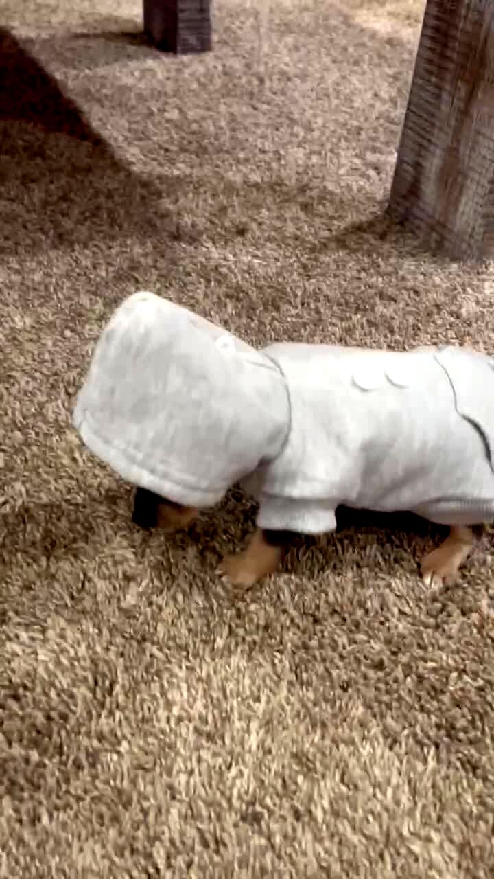 A small dog falls over and wobbles awkwardly as it wears a little sweater in a living room.