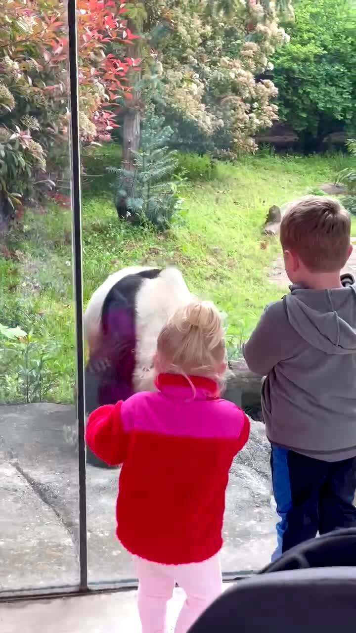 A tot girl stands behind a window at a zoo when the Panda Bear wipes his backside up against the pane.
