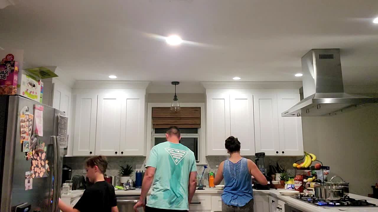 A man whips a woman with a towel in a kitchen and she throws an egg at him and misses and hits the teen girl with the camera.