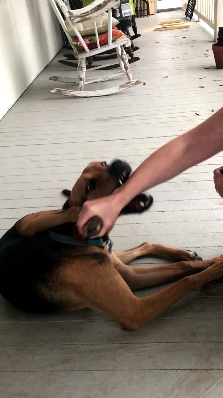 A dog groans/low growls at a teen boy each time he says "hey" to him.