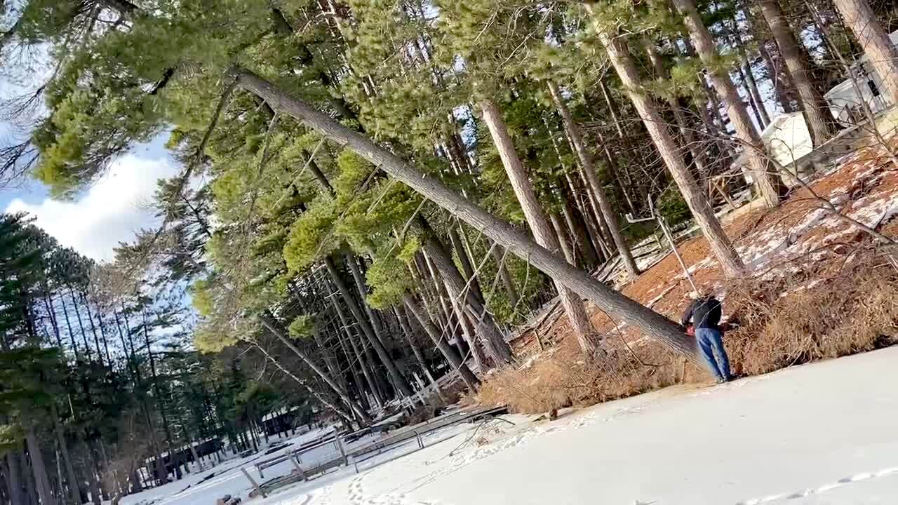 A man chainsaws a tree down outside then tree falls and a piece of branch hits man behind camera and he drops phone.