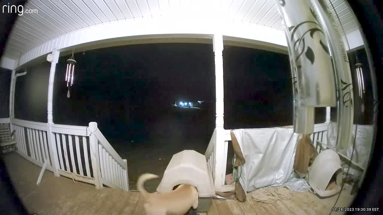 A pit bull dog runs into a man on a porch, and the man loses his shoe when he falls down. Security footage.