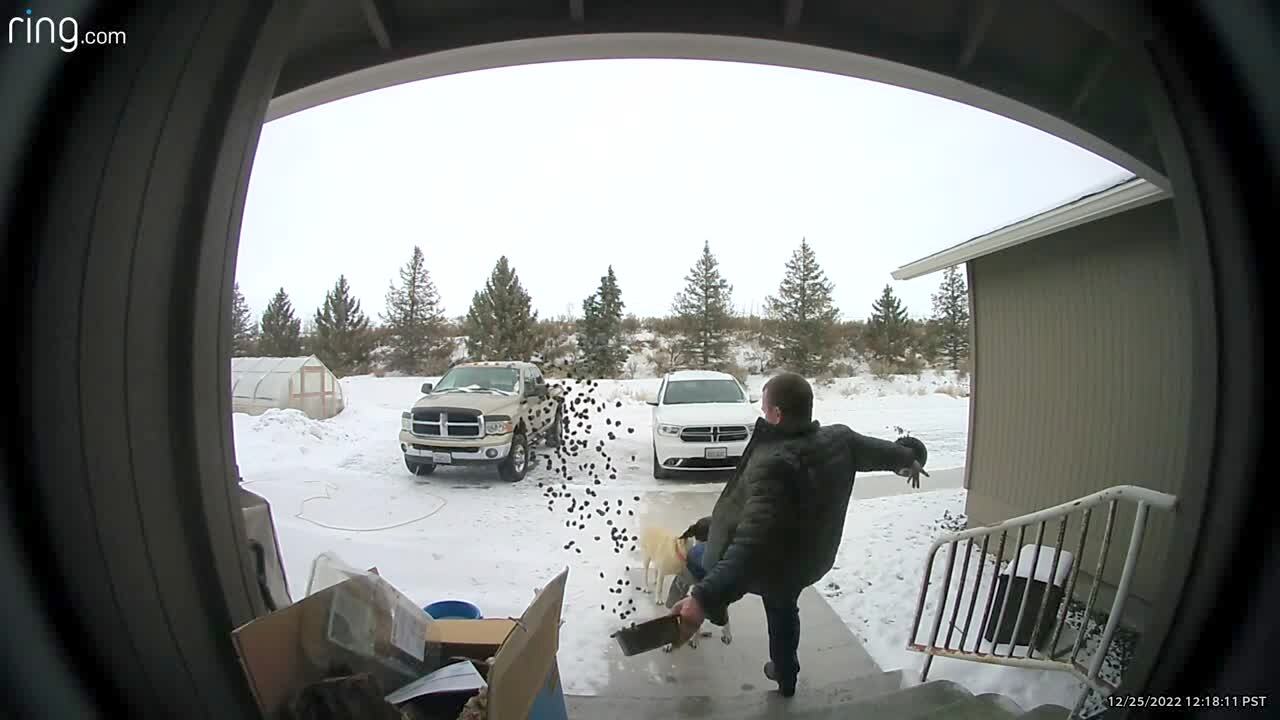 A man slips and falls on icy porch steps and throws the dog food bowl he was bring out to his dogs, sending kibble flying into the air. Security footage.