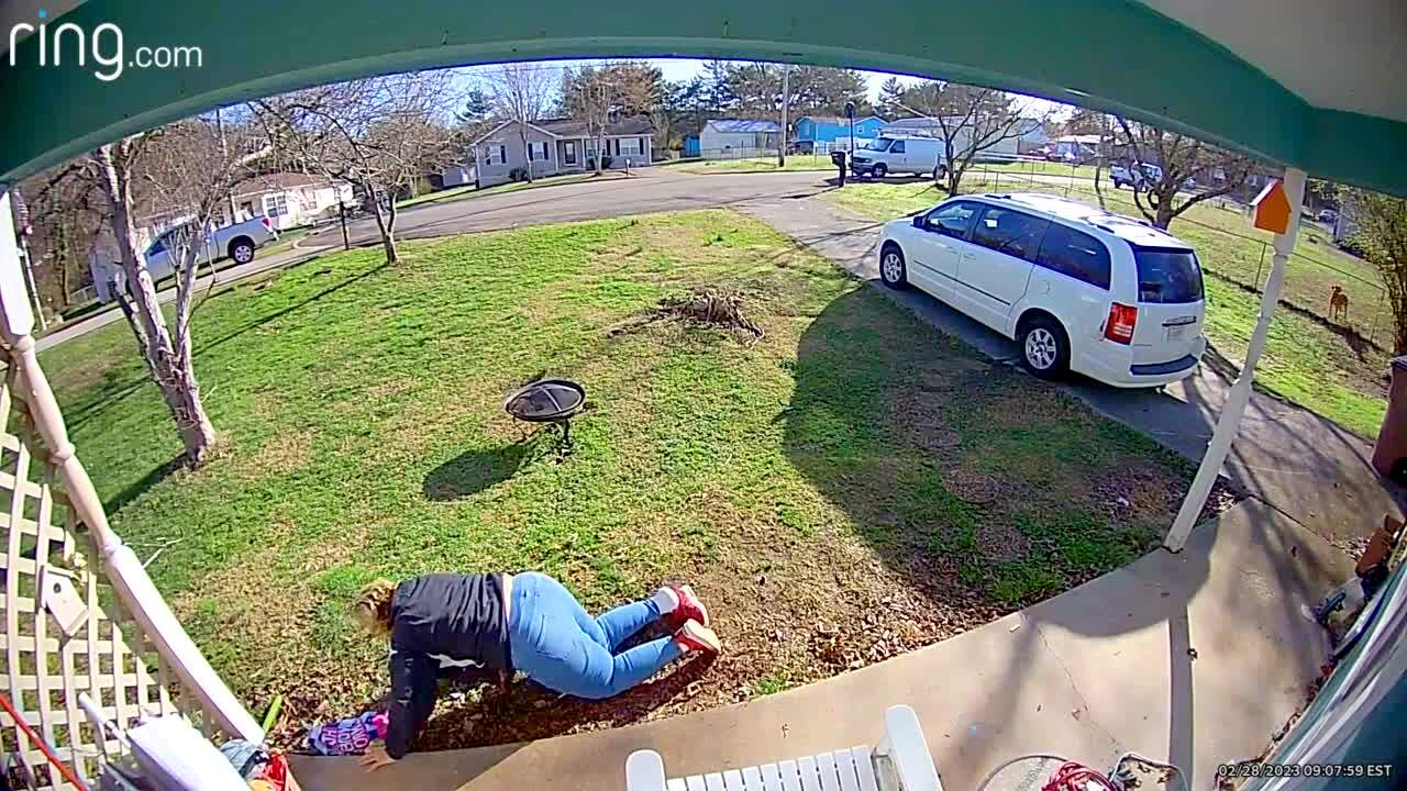 A woman walks up to the front door of a house when she trips and falls. Security footage.