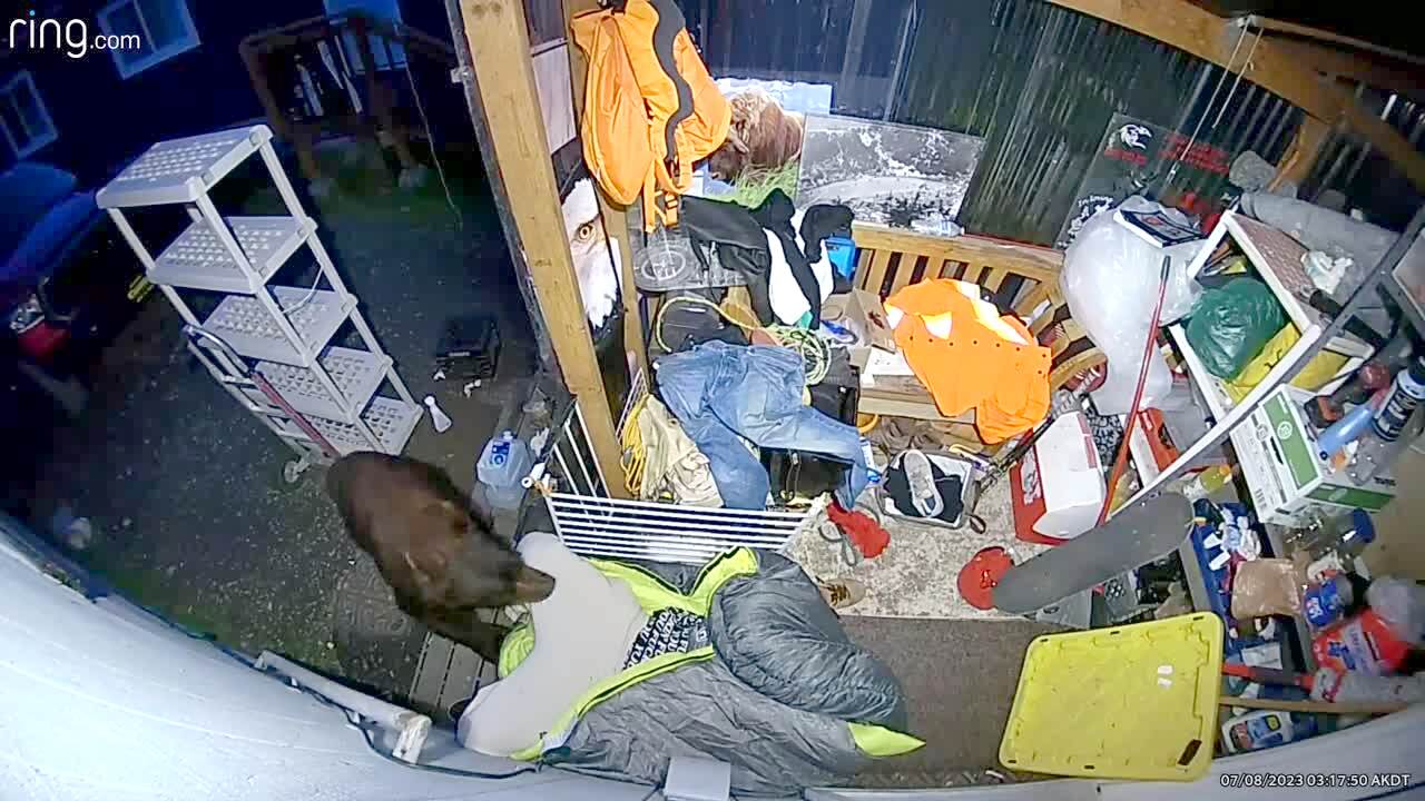 A man lies down on a messy porch with a blanket over his head when a curious bear unwittingly steps on his groin. The man screams, startling the bear while the panicked man runs into the house. Security footage.