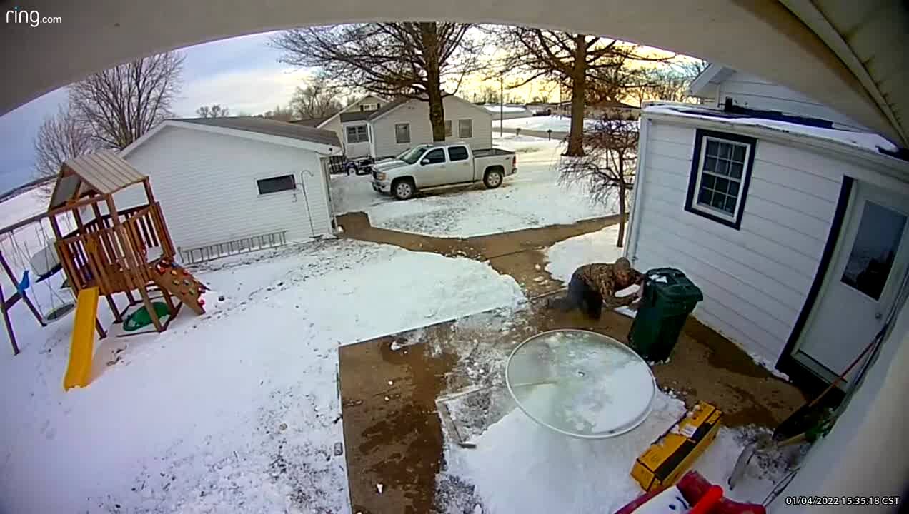 A man slips and falls in a snowy yard as he goes to let his geese out from their coop. Security footage.