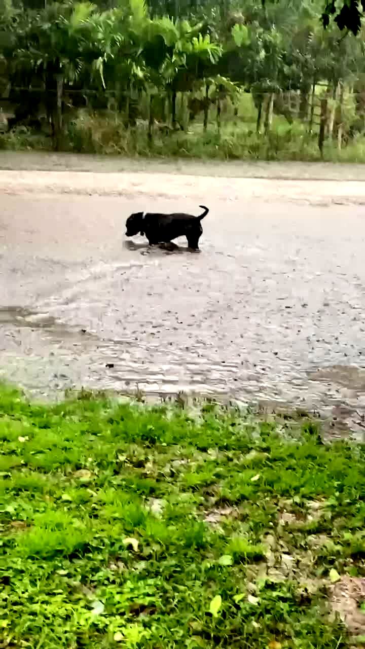 A pit bull dog plays in a deep puddle in a yard during a storm, and a woman asks her if it is fun, then she jumps and runs back to the house when she hears thunder.