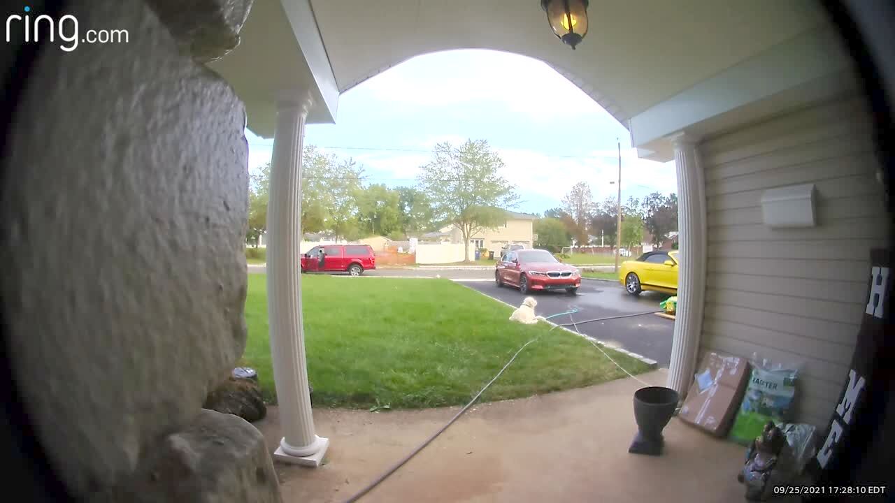 A dog sits in a front yard, then a woman tells him to go greet a man who walks up to the front door, but the dog's leash is tied to a pillar that falls down when he runs. Security footage.