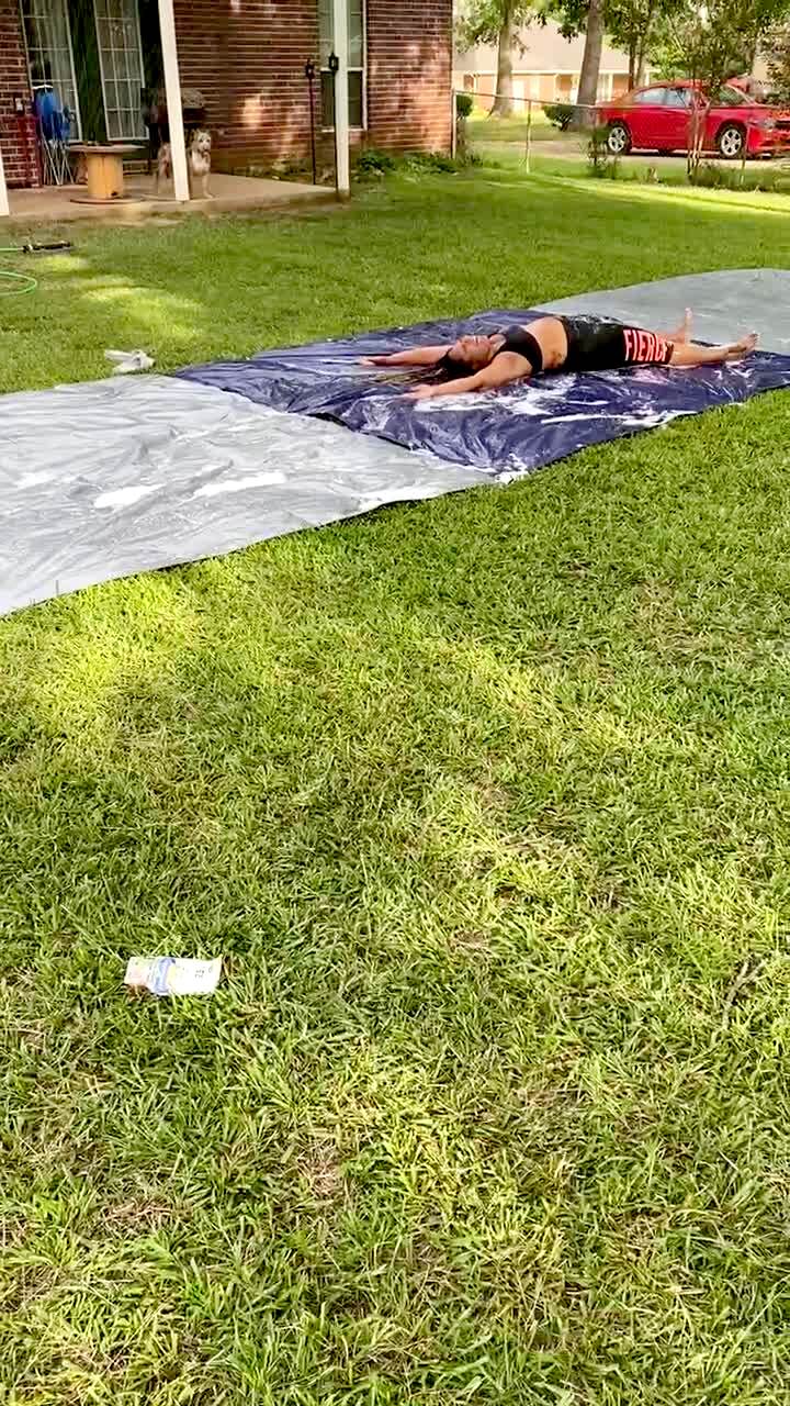 Water pours into a backyard, then a man yells at a Saint Bernard dog who holds down the side of an inflatable swimming pool.